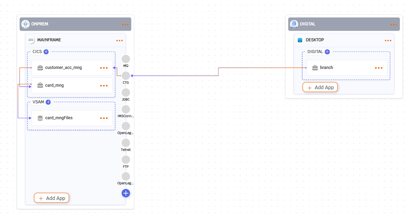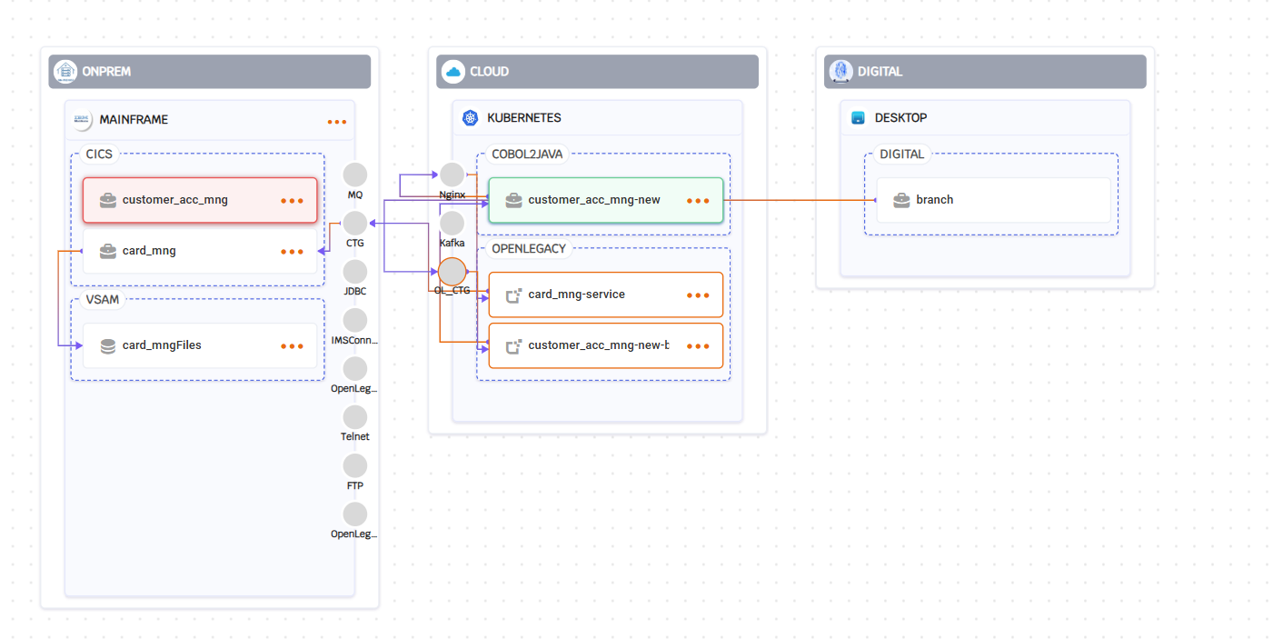 branch (Digital desktop app) calls CTG → routes directly to customer_acc_mng (CICS) → calling.card_mng → uses VSAM.